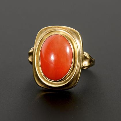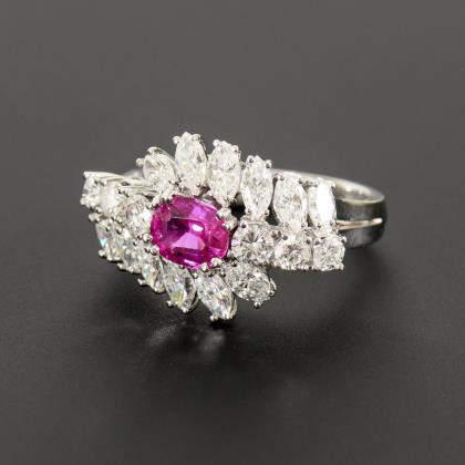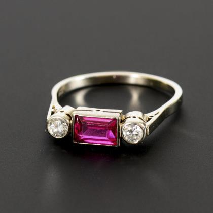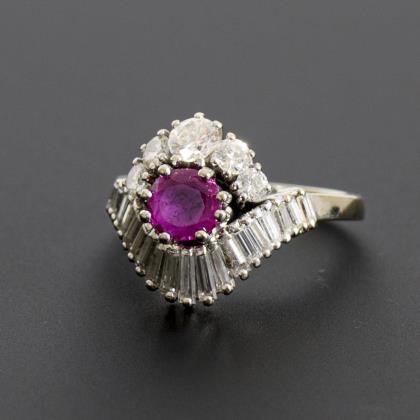Alliance ring with cherry-red colored stone, probably spinel, and brilliant-cut diamonds.