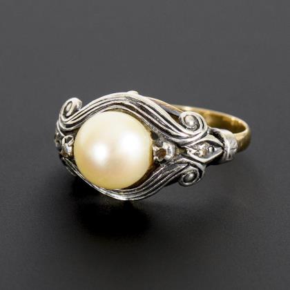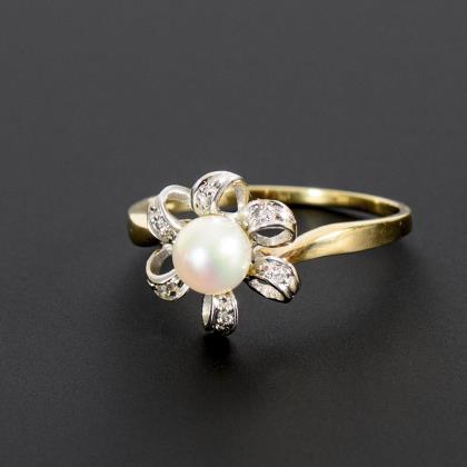 Bicolor-Ring mit einer schmalen Ringschiene in Gelbgold, und einem Ringkopf in Weißgold, dieser schleifenbandartig zu einer Blüte gelegt und mit insgesamt 6 Achtkant-Diamanten besetzt, zentral eine Perle