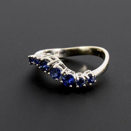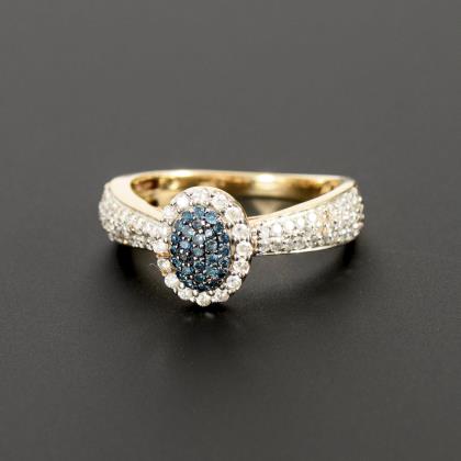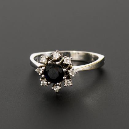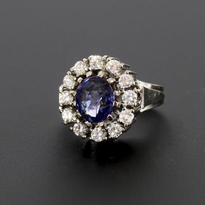 Ring with blue colored stone, probably sapphire, and diamonds.