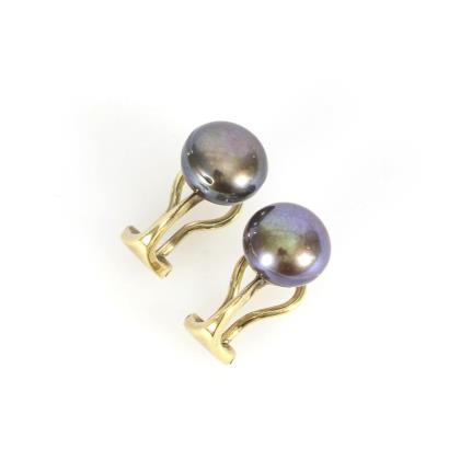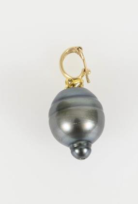 Anhänger mit dunkler Tahiti-Perle in barocker Wuchsform an einem mit Clip rückwärtig zu öffnenden Haken