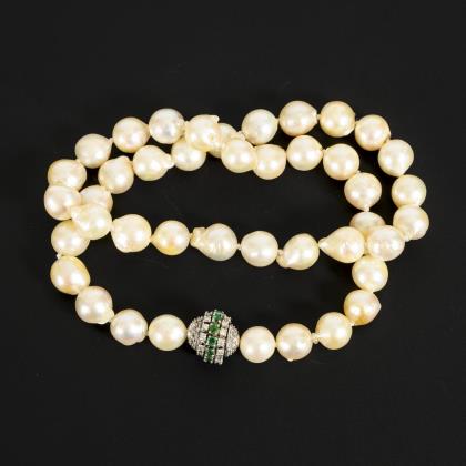 Kette aus einzeln geknoteten, barock geformten cremefarbenen Perlen mit einer Kugelförmigen Zierschließe in Weißgold. Diese Umläufig mit 24 Achtkant-Diamanten und 12 grünen Farbsteinen, wohl Smaragde, besetzt