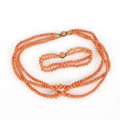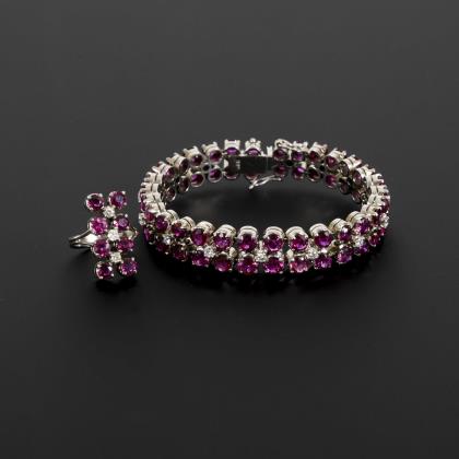 Schmuckset bestehend aus einem Ring und einem Armband je mit einem Besatz aus rundfacettierten, roten Farbsteinen, wohl Rubinen, und kleinen Brillanten. Das Armband mit Kastenschloss und doppelter Achtersicherung