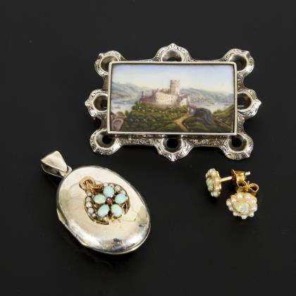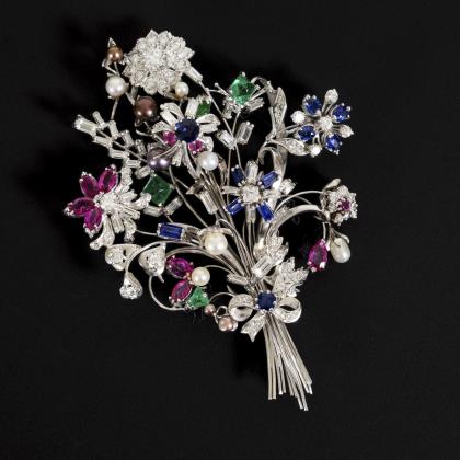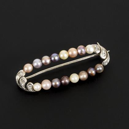 Ovale Brosche besetzt mit 12 kleinen Diamanten und Perlen in verschiedenen Farbabstufungen der Farbtöne Crème, Rosafarben und Grau