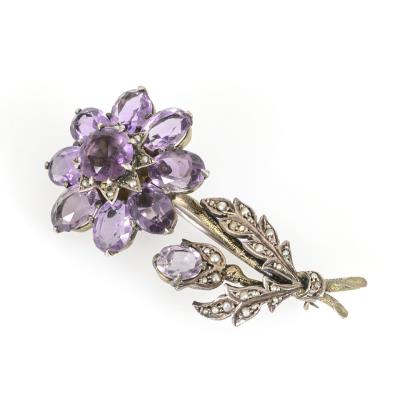 Historische Brosche besetzt mit 9 oval- und einem rund-facettierten Amethysten und kleinen Saatperlen in Silber gefasst, in Form einer Blüte und einer kleinen Knospe mit Blattzierwerk gestaltet