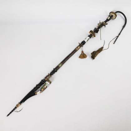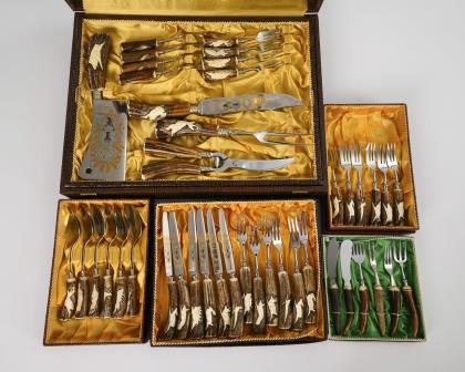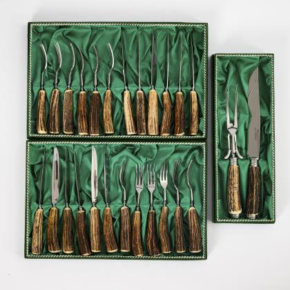 Papierbeklebtes barockes? Fernrohr mit gedrechselten Hornstücken, Schnupfetui 2 Taschenmesser, Zweizink-Gabel und Messer