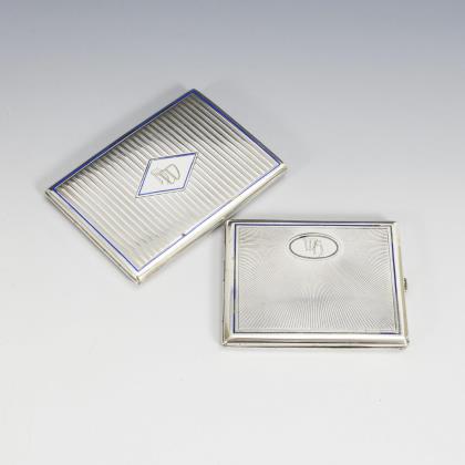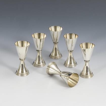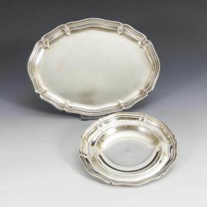Beidseits floral reliefiert. 130 Teile: 12 Messer, 12 Gabeln, 12 Esslöffel, 10 Menümesser, 10 Menügabeln, 24 Dessertmesser, 12 Dessertgabeln, 12 Kaffeelöffel, 6 Kuchengabeln, 11 Mokkalöffel, 1 Soßenkelle, 2 verschiedene Servierlöffel, Buttermesser, Käsemesser, 2 große Serviergabeln, 2 kleine Serviergabeln. Punzen: Halbmond und Krone, Feingehalt, Manufakturmarke