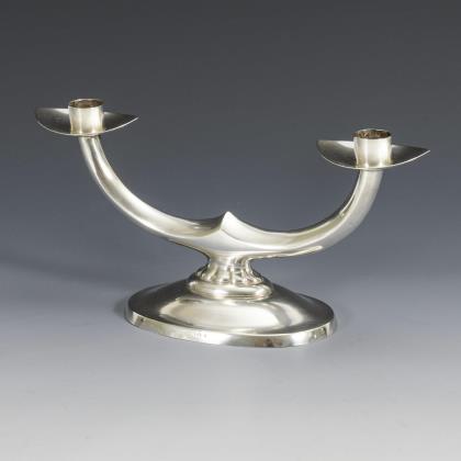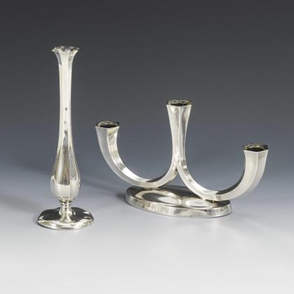 Einflammige glatte Leuchter mit Balusterschaft. Handleuchter mit reliefiertem Randdekor und Ringhandhabe mit Daumengriff. Punzen: Feingehalt, undeutliche Manufakturmarken