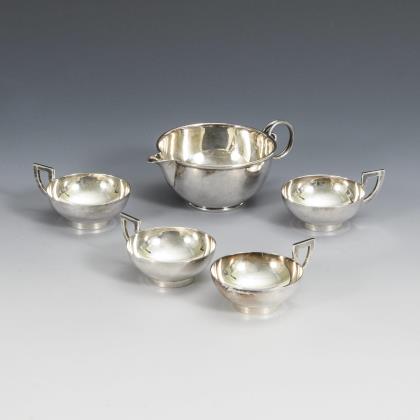 Dreieckige Form mit passig geschweiftem vollem Profilrand, auf der Wandung gravierter bekrönter Löwe, auf der Bodenunterseite gravierte Widmung: Von den Eltern Weihnachten 1904. Punzen: Halbmond und Krone, Feingehalt, Manufakturmarke