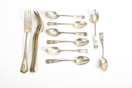 12 silver dinner forks and 6 similar silver-plated dinner knives.