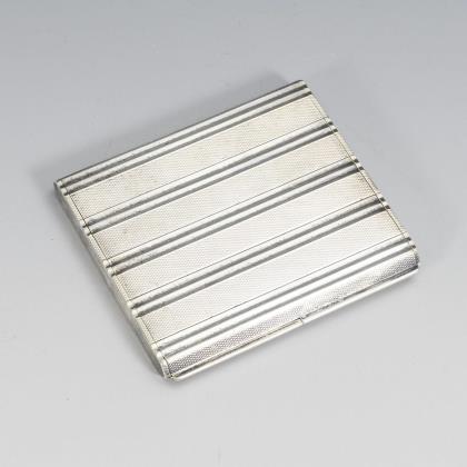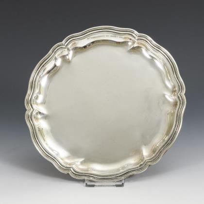 Geschweifte Rechteckform mit reliefiertem Perlleistenrand, seitlich durchbrochen gearbeitete Handhaben. Punzen: Feingehalt, Manufakturmarke