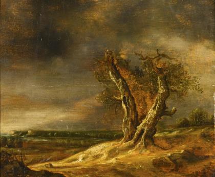 Baroque painter: Wild landscape with a group of trees under a cloudy sky.