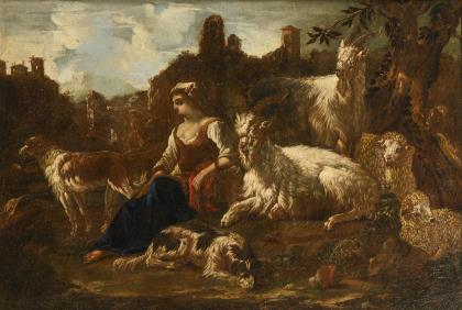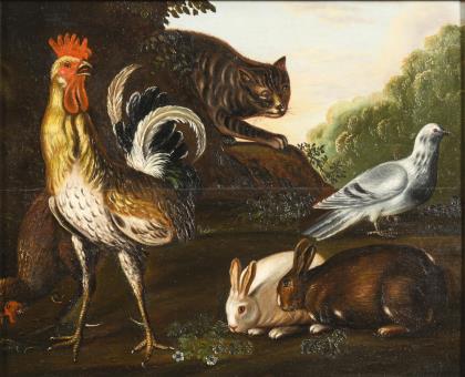 Baroque painter: Landscape with rooster and cat.