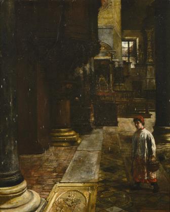 LINDENSCHMIT, Hermann (1857 Frankfurt/Main - 1939 Munich). Dark church interior with altar boy.