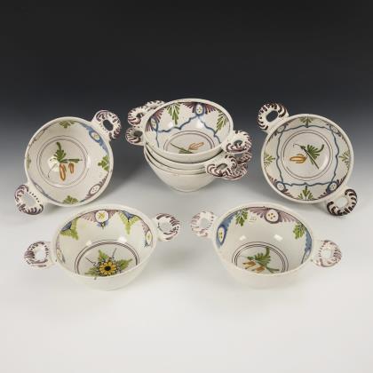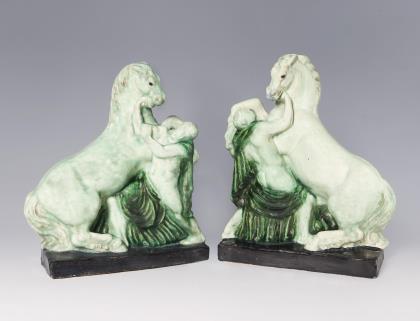 Rötlicher Scherben, hellgrün und dunkelgrün bemalt, glasiert. Sockelböden gefüllt, ohne sichtbaren Manufakturmarken