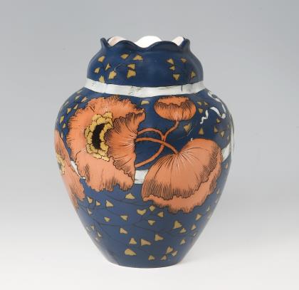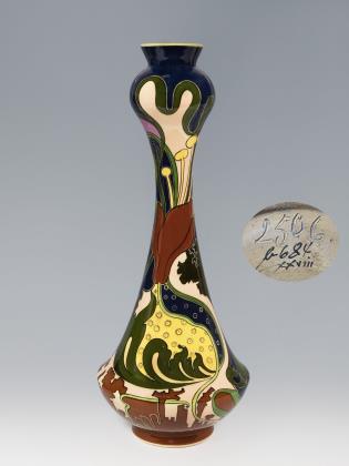Feinsteinzeug, blauer Fond, umlaufend farbig bemaltes florales Ritzdekor. Balusterkorpus mit wellenförmig gebogter Mündung. Pressmarken