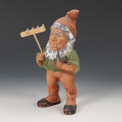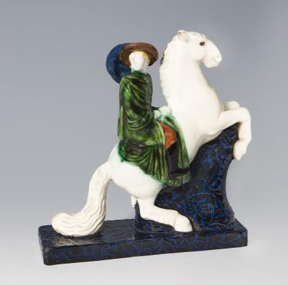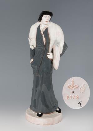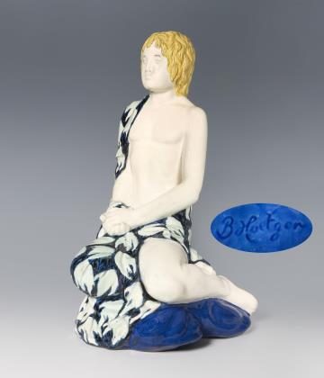 Figur aus der Serie "Licht- und Schattenseiten". Rötlicher Scherben, farbig bemalt, glasiert. Künstler-Signet, Titel, Manufakturmarke, Sockelboden gefüllt