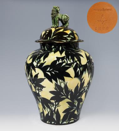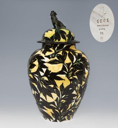 Large Laeuger lidded vase "Lemons". Karlsruhe majolica.