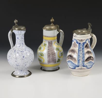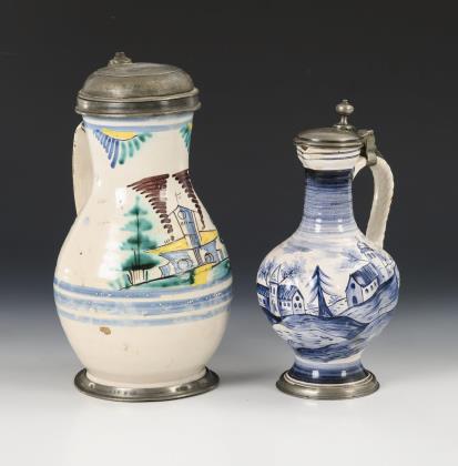 2 faience jugs with architecture. Gmunden and Ansbach.