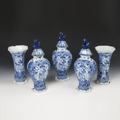 5 Delft faience vases with figure painting. De Vergulde Blompot.