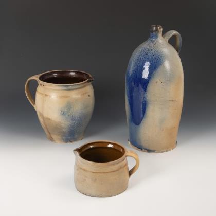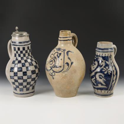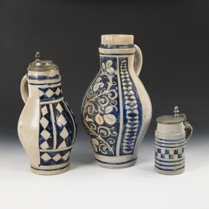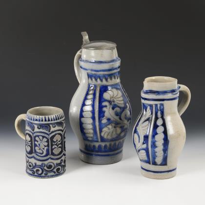2 Rhenish stoneware jugs and 1 beer mug with incised decoration.