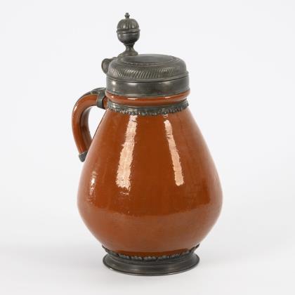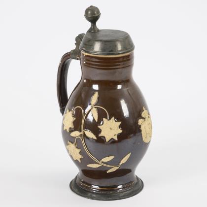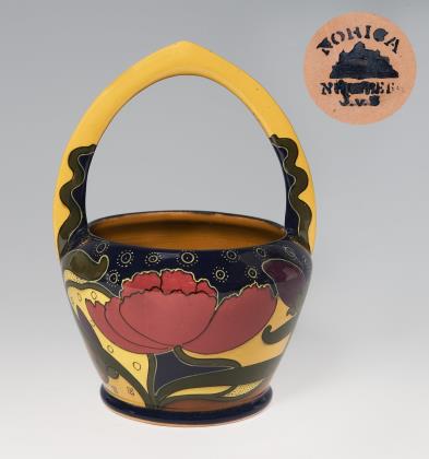 Norica-Fayence, farbige Unterglasurmalerei in Fadenrelief-Technik. Pressmarken, Ritzmarke, Malermarke. Metall-Montierung mit seitlichen Handhaben