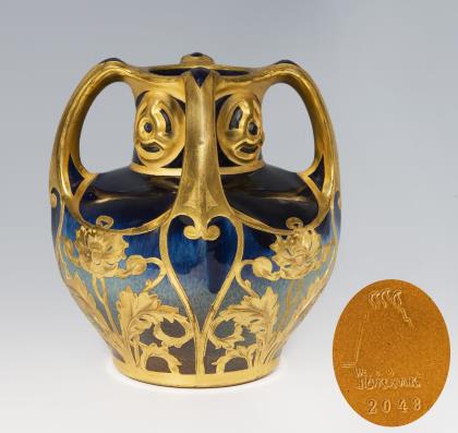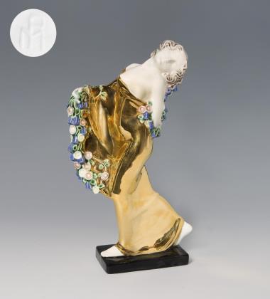 Das Modell von Powolny entstand in Zusammenarbeit mit Bertold Löffler (1874 Nieder-Rosnthal - 1960 Wien). Goldfond, Sockel mit schwarzem Fond. Firmenmarken mit Modellnummer