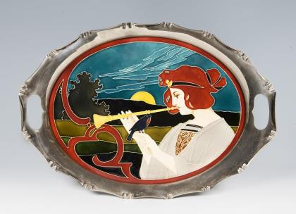 Oval Art Nouveau tray with tile. Johann von Schwarz, Nuremberg.