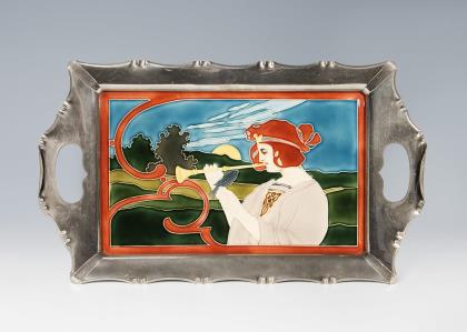 Art Nouveau tray with tile. Johann von Schwarz, Nuremberg.