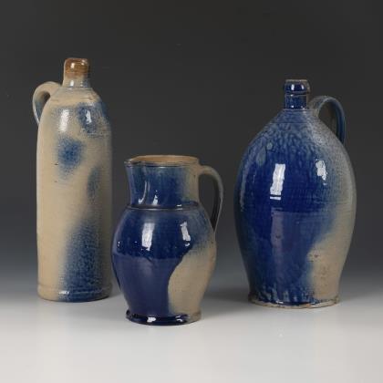 2 narrow-necked bottles and 1 milk jug with blue aprons. Bürgel.