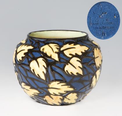 Small Laeuger vase with leaf decoration. Karlsruhe majolica.