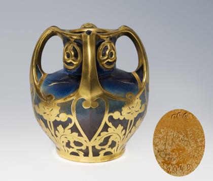 Vorwiegend blau verlaufend glasiert, vergoldete galvanoplastische Metallauflage mit floralem Dekor. Pressmarken