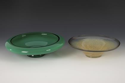 Kelch mit türkisem Fuß und Goldflitter, kleinerer Kelch und Vase mit 2 Henkeln