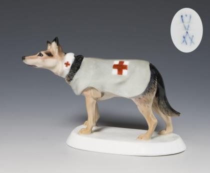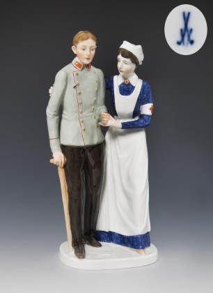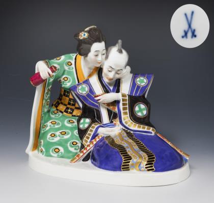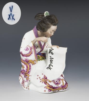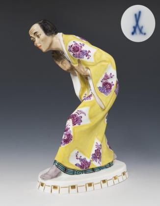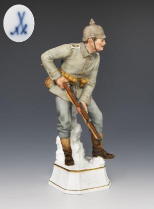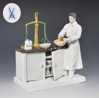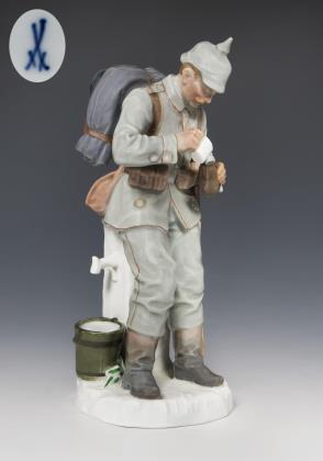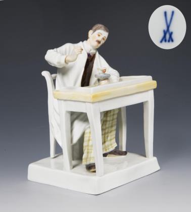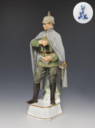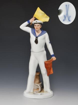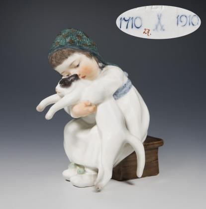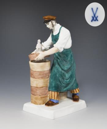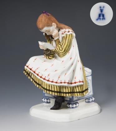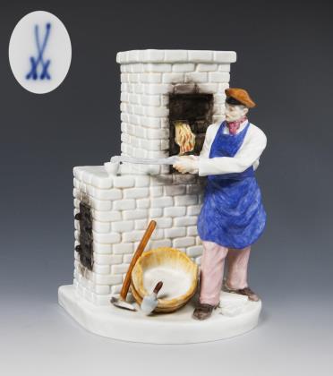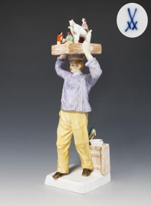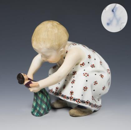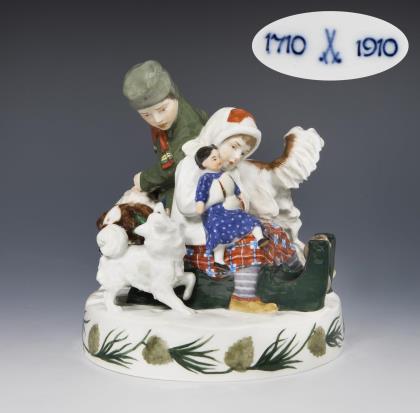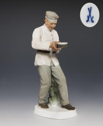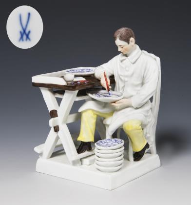 Sehr detailreich modelliert, farbig bemalt. Ritzmarke, Pressmarke, Malermarke, Schwertermarke, blaue Jubiläumsmarke 1710-1910