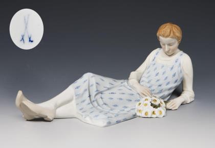 Farbig bemalt, Haarband gold staffiert. Unglasierter Boden, Ritzmarke, Pressmarke, Schwertermarke