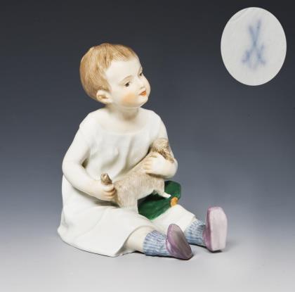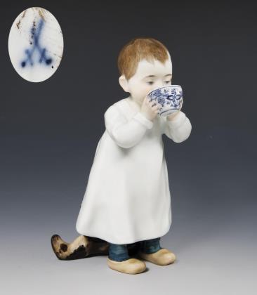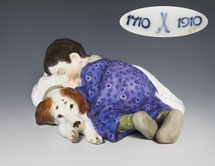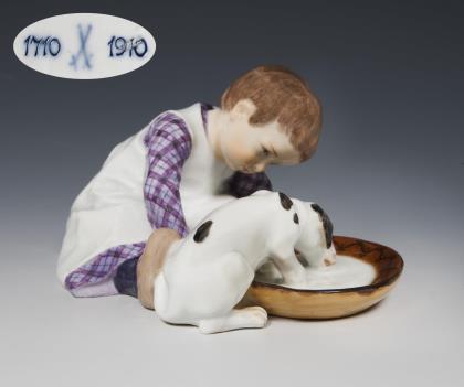 Art Nouveau figurine: Child with drinking dog. Meissen.