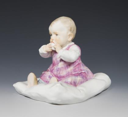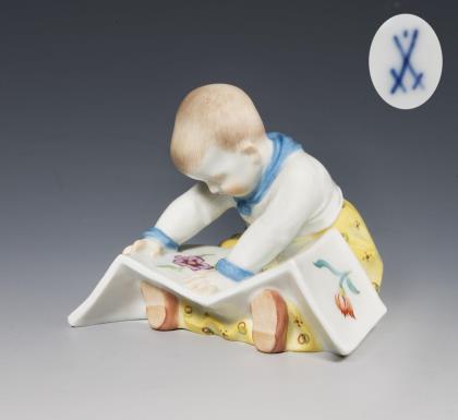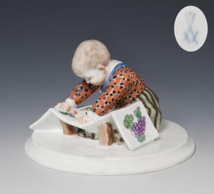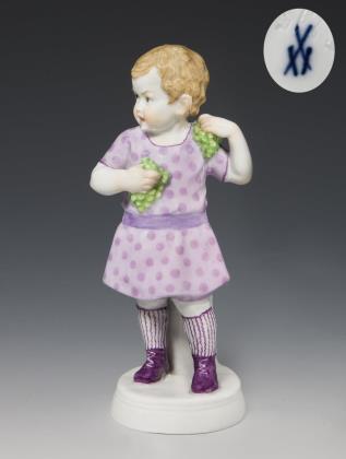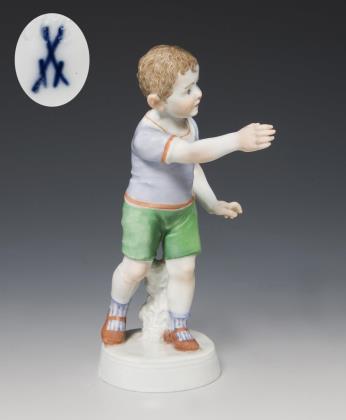 Pendant zu Modell-Nr. F 222 "Knabe, (nach Weintrauben) greifend", farbig bemalt. Ritzmarke, Pressmarke, Malermarke, Schwertermarke, Künstler-Signet
