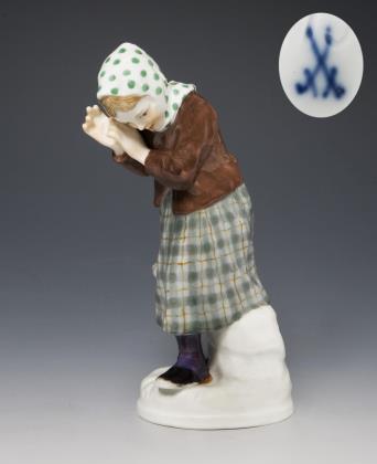 Art Nouveau child figurine: Girl, (defending snowballs). Meissen.