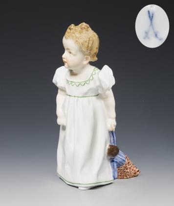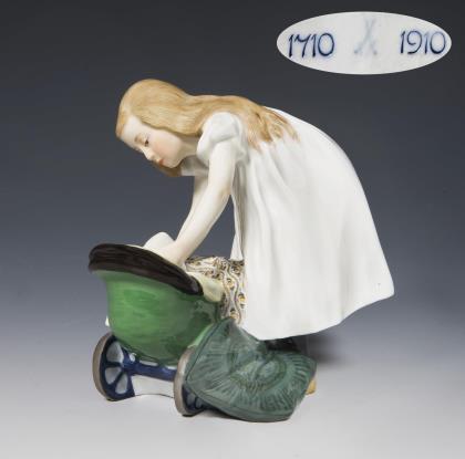 Art Nouveau figurine: Girl with doll's pram. Meissen.