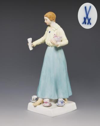 Pendant zu Modell-Nr. F 215 "Mädchen mit Weintrauben", farbig bemalt. Ritzmarke, Pressmarke, Malermarke, Schwertermarke, Künstler-Signet
