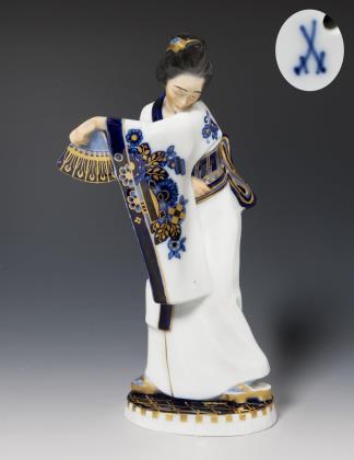 Farbige Unterglasurbemalung, Haarkamm und Fächer gold staffiert. Ritzmarke, Pressmarke, Schwertermarke