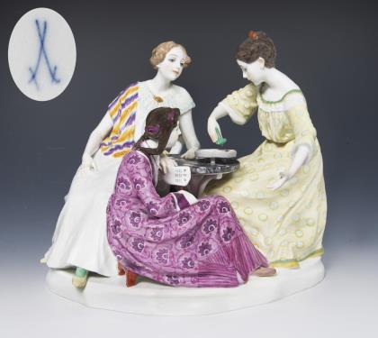 Art Nouveau figurine group: Girl playing roulette. Meissen.
