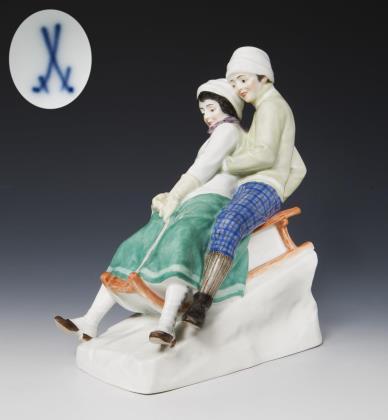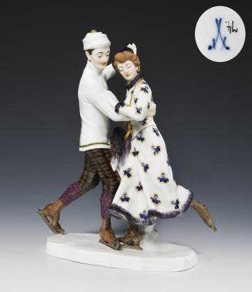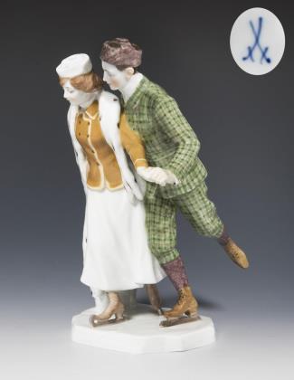 Pendant zu Modell-Nr. E 295 "Schlittschuhläufer", farbig bemalt. Pressmarken, Malermarke, Schwertermarke