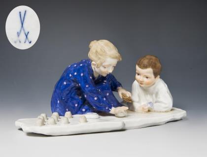 Art Nouveau figurine group: Children, baking sand molds. Meissen.
