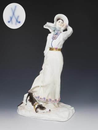 Large Art Nouveau figurine: Lady with dog. Meissen.