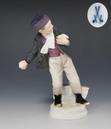 Art Nouveau child figurine: Boy throwing snowballs. Meissen.