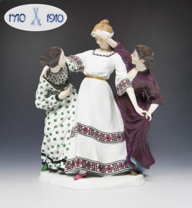 Art Nouveau figurine group: Girl playing blind cow. Meissen.