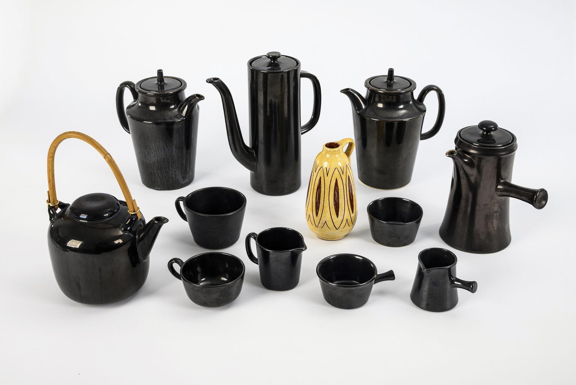 11 black ceramics and 1 yellow vase by Hedwig Bollhagen. HB workshops for ceramics in Marwitz.