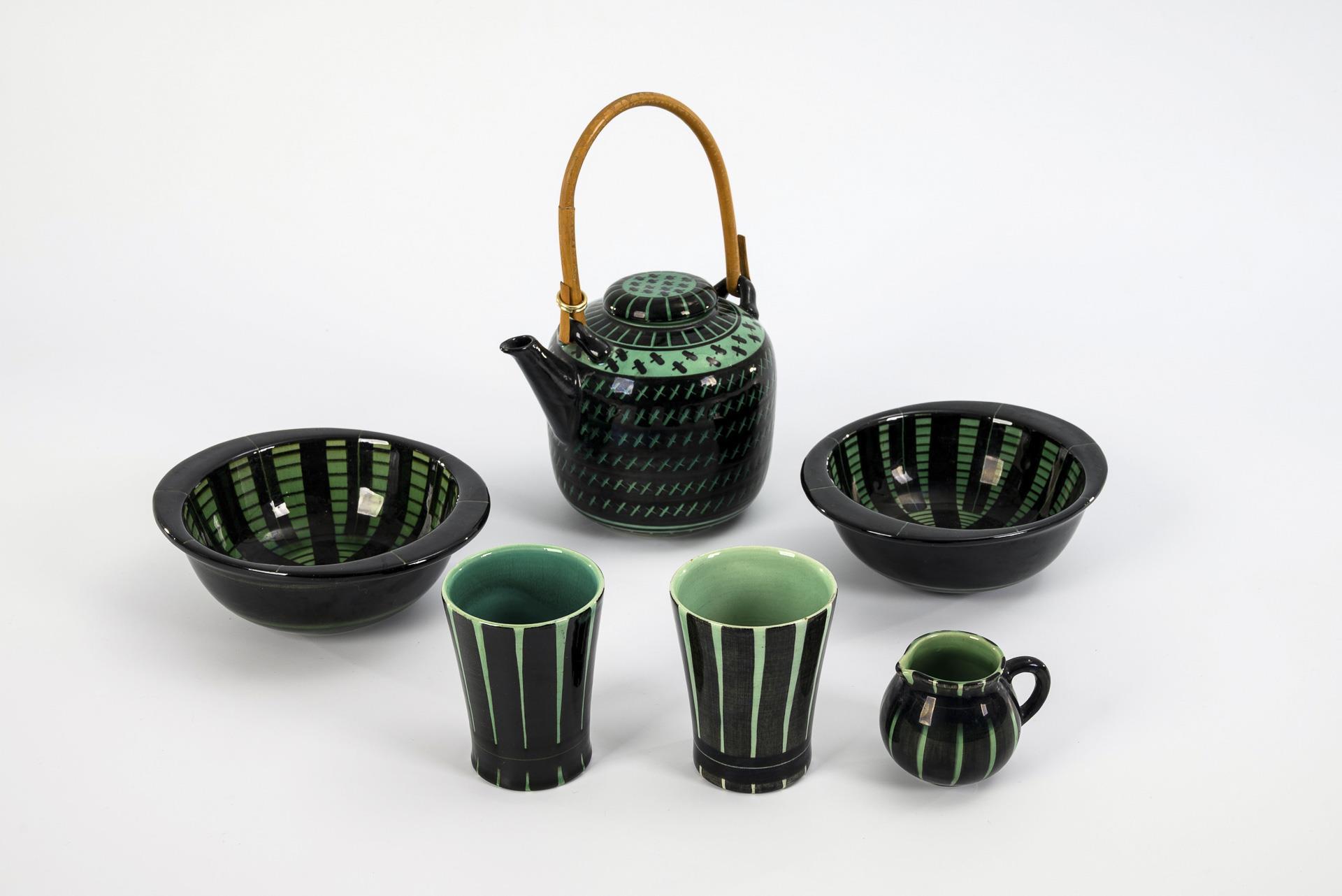 6 parts of a black and green tea set by Hedwig Bollhagen. HB workshops for ceramics in Marwitz.