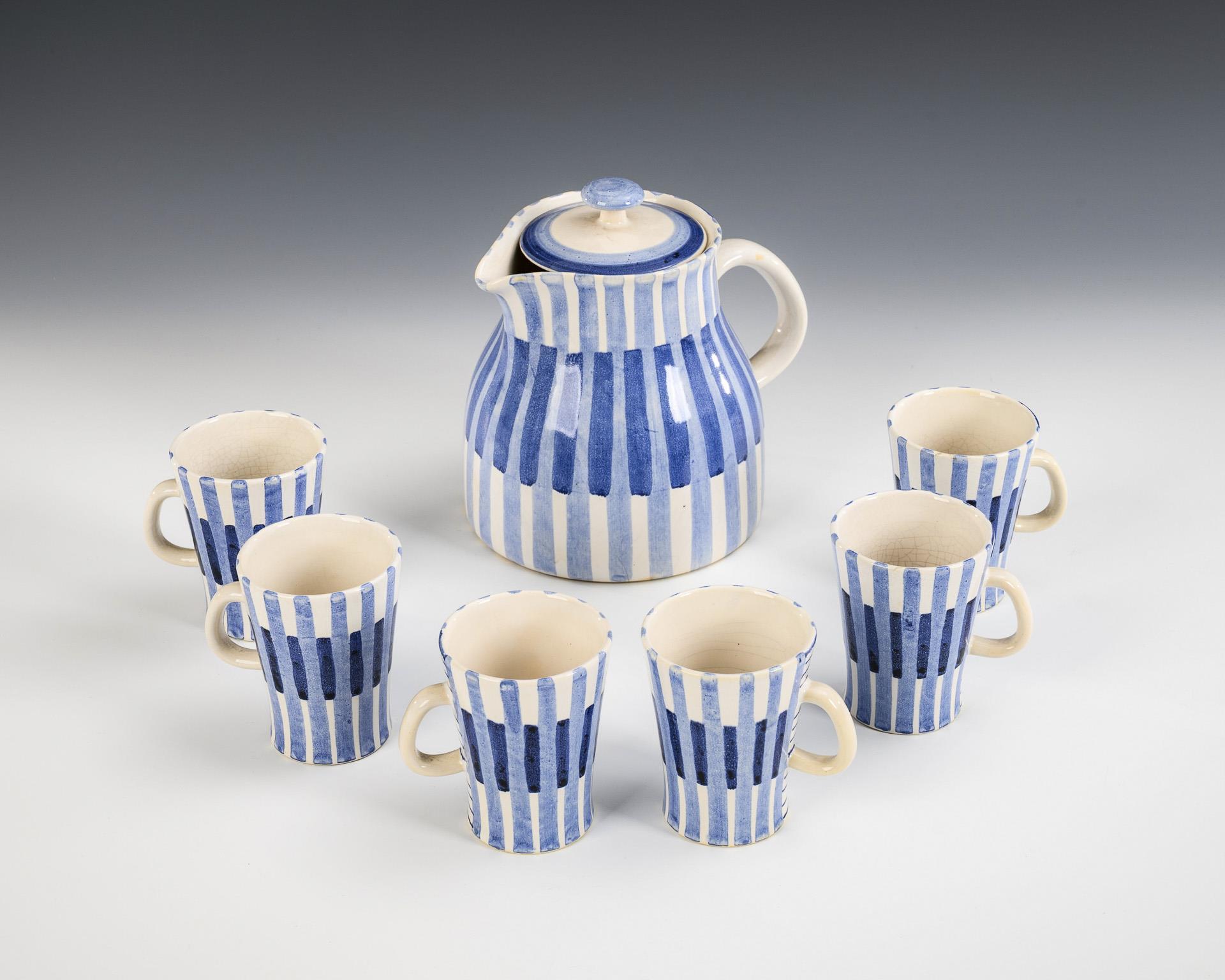 1 pot and 6 cups of a light blue striped coffee or tea set by Hedwig Bollhagen. HB workshops for ceramics in Marwitz.