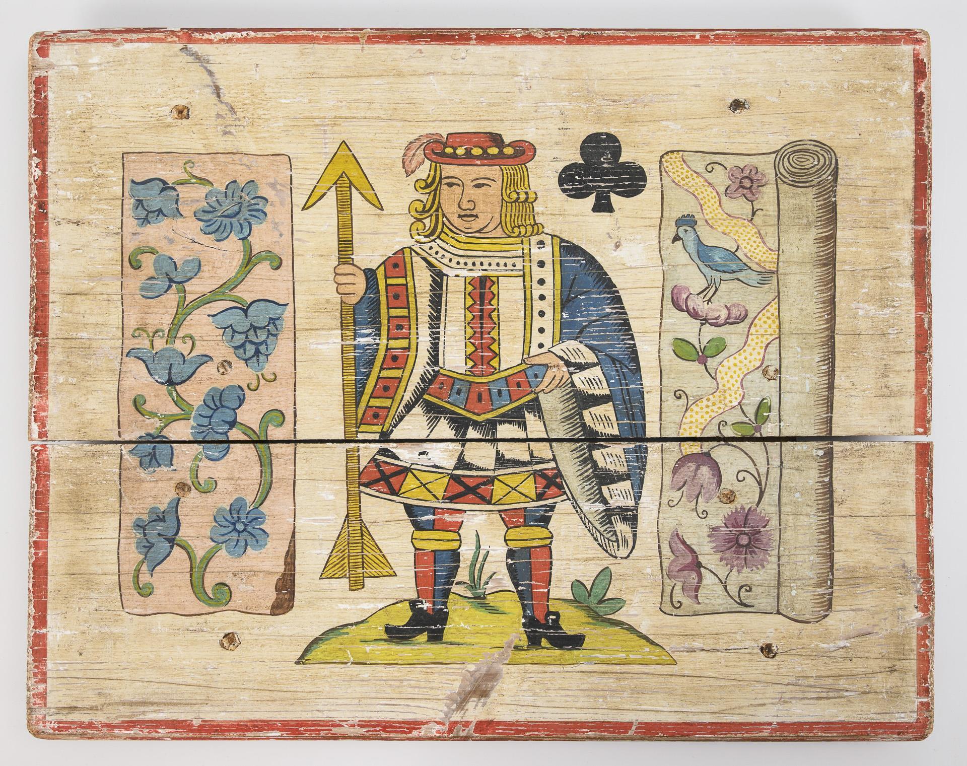 29. Museale Spielkarten-Tafel (vermutl. ein Handwerkerschild der Kartenmacher) aus Holz. Auf der Rückseite ist „Made in Spain“ eingebrannt. Bemalt ist die Tafel mit einem Kreuz Bube (Trefl Valet) aus dem Rouen-Kartenbild das seit 1500 nachweisbar ist. Die Bildkomposition stammt vermutlich aus Ende 18. – Anfang 19. Jahrhundert. Startgebot: 150 €